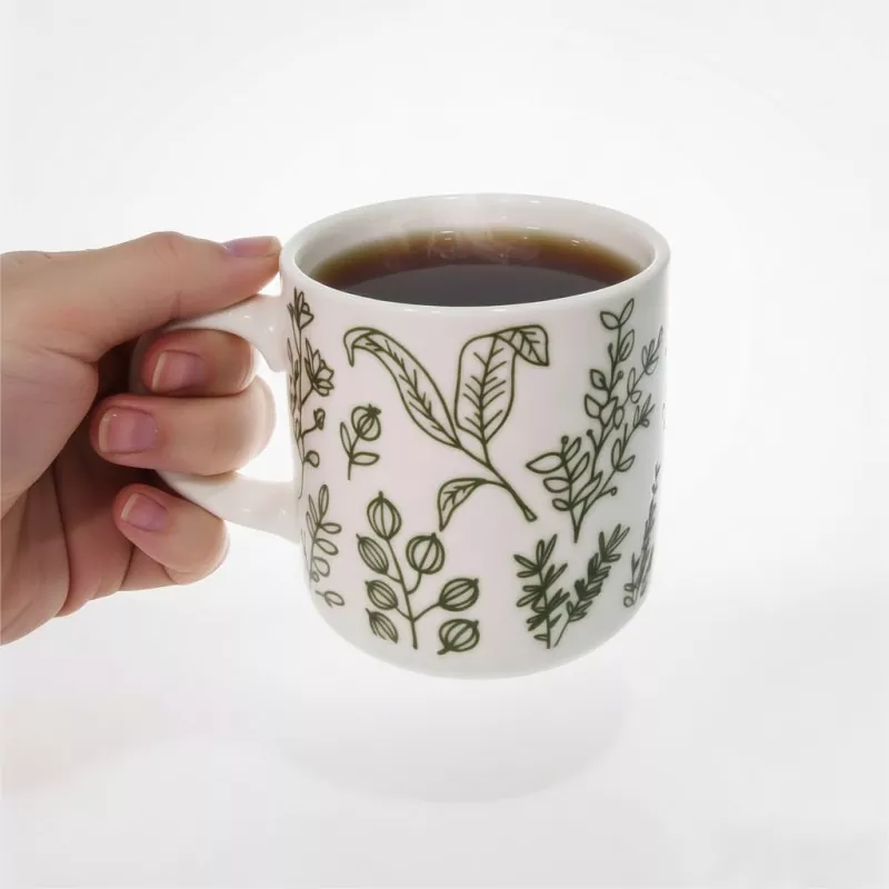1. इस मग में दृश्य केंद्रबिंदु के रूप में एक सरल और प्राकृतिक हरा वनस्पति प्रिंट है: