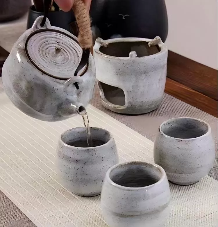 इस पारंपरिक चाय सेट में एक चायदानी और तीन चायपत्तियाँ शामिल हैं, और पॉट को गर्म रखने के लिए एक सिरेमिक स्टैंड भी शामिल है।